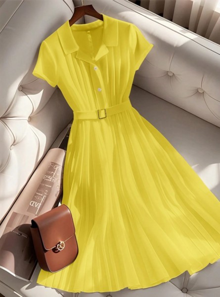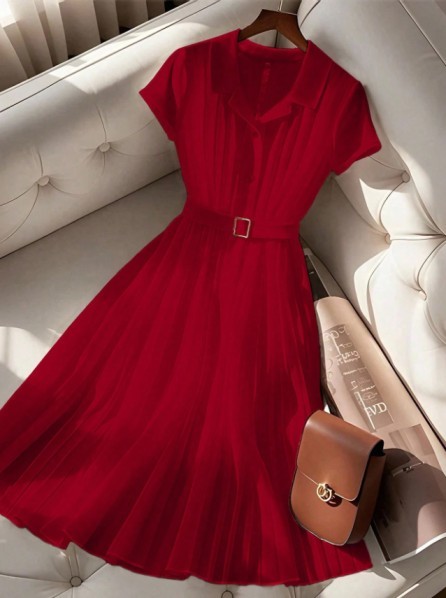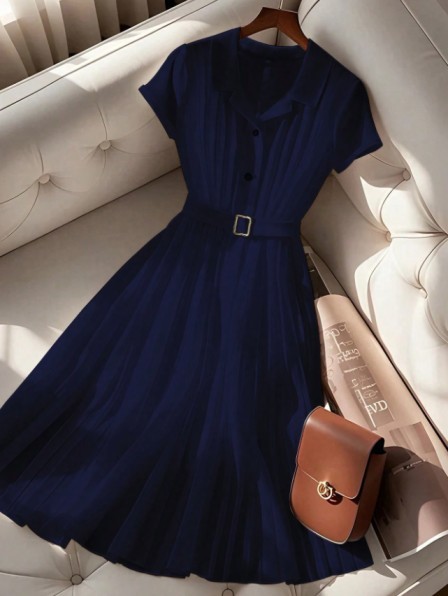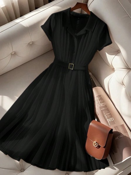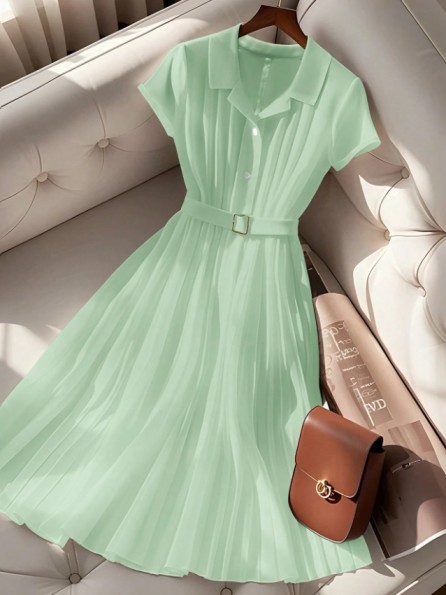French Style Simple Pleated Chiffon Polo Collar Short Sleeve Dress