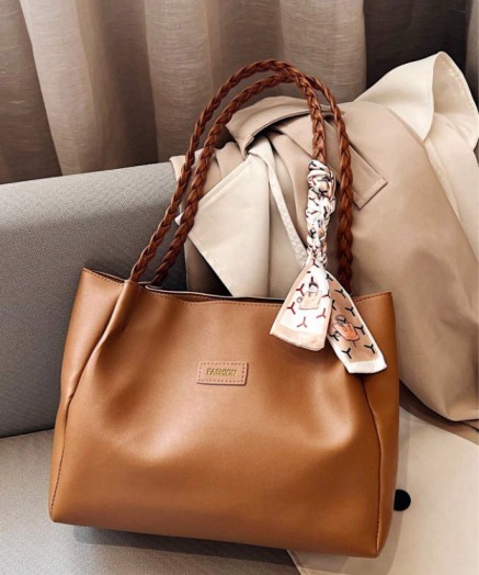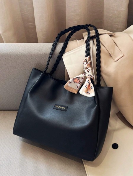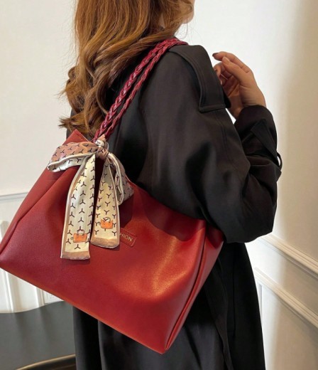 Leather Large Capacity Shoulder Bag With Silk Scarf Decor,